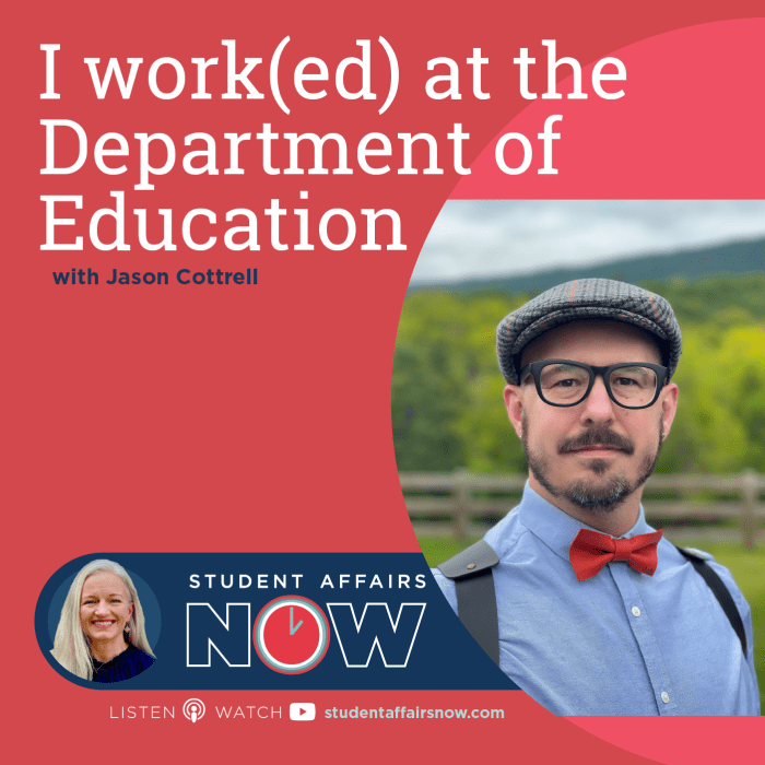 I recently had the pleasure of speaking with Dr. Heather Shea on the Student Affairs Now podcast about my experience at the U.S. Department of Education. We discussed my day-to-day work, key developments that have taken place, what may be on the horizon, and where I see my journey heading next. Feel free to tune in on your favorite podcast platform or watch the full conversation on YouTube.